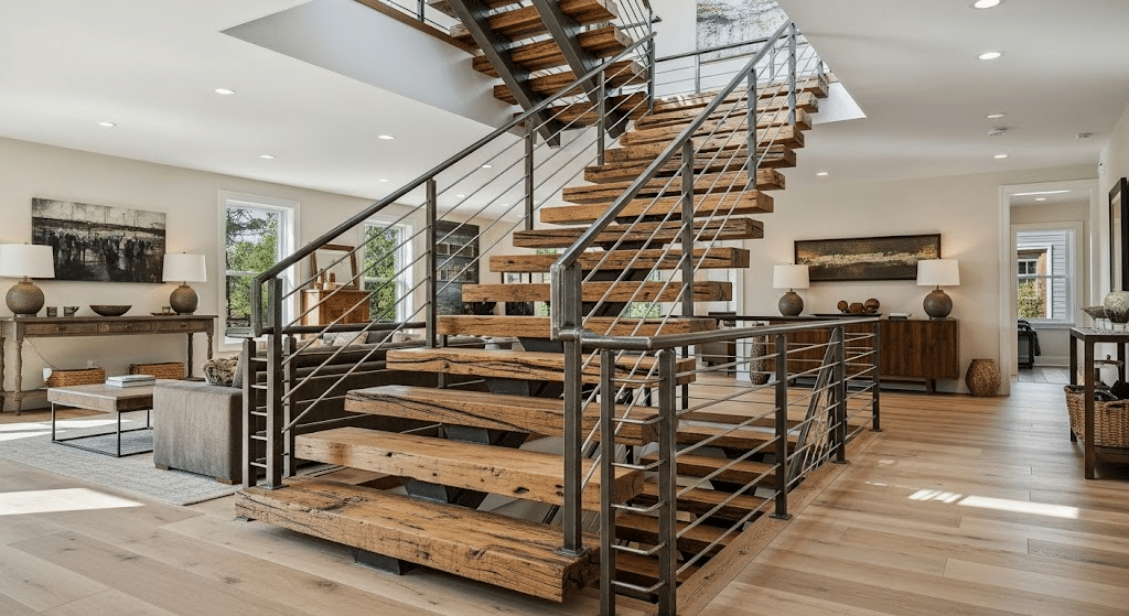 Floating staircases eliminate traditional risers and visible support structures, creating the impression that individual treads suspend independently in space. This design approach fundamentally changes how staircases interact with surrounding spaces by maintaining clear sight lines and allowing natural light to pass through rather than being blocked by solid construction. Beautiful custom stairs of this type require precise structural engineering to ensure that hidden support systems can handle both static loads and dynamic forces created by regular use.