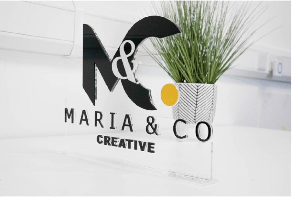 An acrylic desk sign offers a modern and clean appearance. It is often used in offices, studios, and reception areas where a minimal and professional look is preferred.
